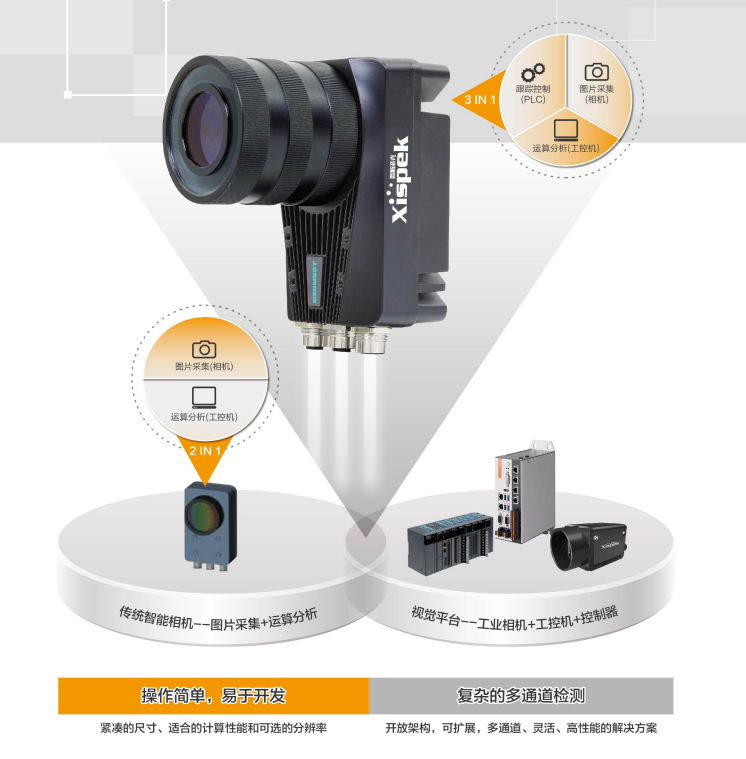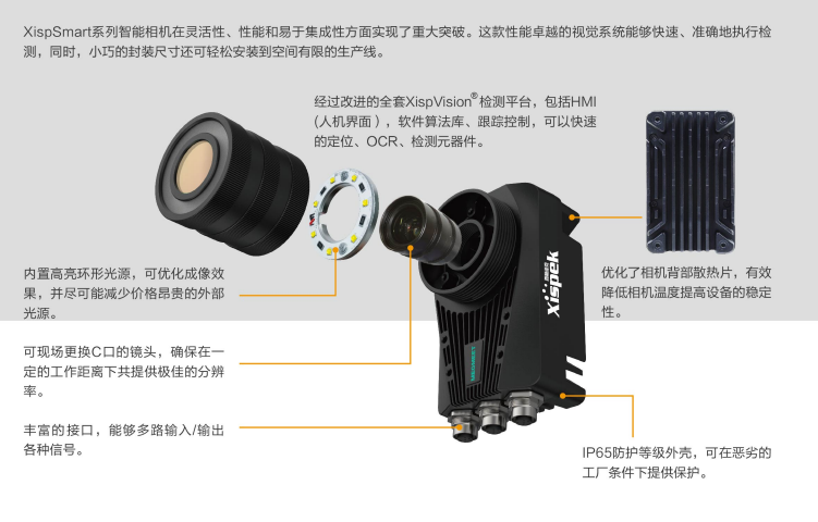 XispSmart-S 系列智能相机不满足于将相机和运算单元集成,而且通过一个独立的FPGA实现了实时的控制功能。虽然体积小,一个相机就是一个完整的视觉系统,不需要PLC也不需要外部的控制系统。